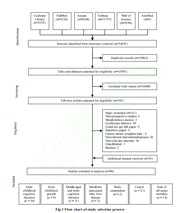 血或膳食中胆碱及含胆碱物质含量进行测量;(3)研究结局:婴幼儿认知功能及生长发育、 老年认知功能、脂肪肝、体成分、癌症、死亡风险等相关结局;(4)发表年限:2003 年 1 月 1 日