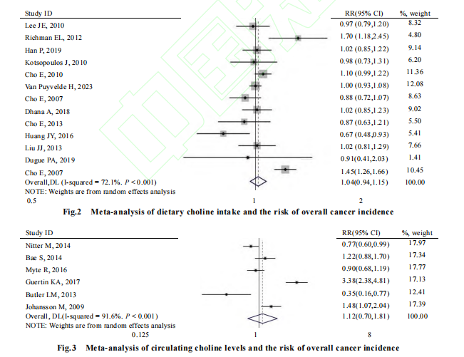 满足身体需要,故需要从食物中进一步获得[2]胆碱在各类食物中存在形式主要为磷酸胆碱、甘油磷酸胆碱、磷脂酰胆碱(phosphatidylcholine,PC,又名卵磷脂)、鞘磷脂,小部分以乙酰胆碱和胞苷-5’-二磷酸胆碱的形式存在[3]胆碱要在小肠被消化吸收,在体内可分布于所有组织和器官[4]。胆碱以肝、肾、大脑为主要储存部位,还可储存于乳腺、胎盘等部位,游离胆碱可通过血脑屏障。胆碱及其代谢产物主要生理作用包括参与生物膜构成、作为神经细胞结构性物质和递质参与大脑和神经系统信号传导过程[3,5-6]、影响同型半胱氨酸代谢而促进甲基基团转移[7]、促进肝脏脂肪代谢[8-10]等。大部分研究显示,国内外人群的胆碱摄入量并未达到适宜摄入量(adequate intakes,AI)。本文系统查阅并收集公开发表的相关资料和文献数据,总结胆碱的多种健康效应,包括但不限于对婴幼儿认知功能及生长发育、老年认知功能、脂肪肝、体成分等方面的影响进行系统综述,对胆碱与癌症死亡风险进行 Meta 分析,为胆碱的膳食营养补充提供依据,同时也为胆碱的健康科普教育提供支持。